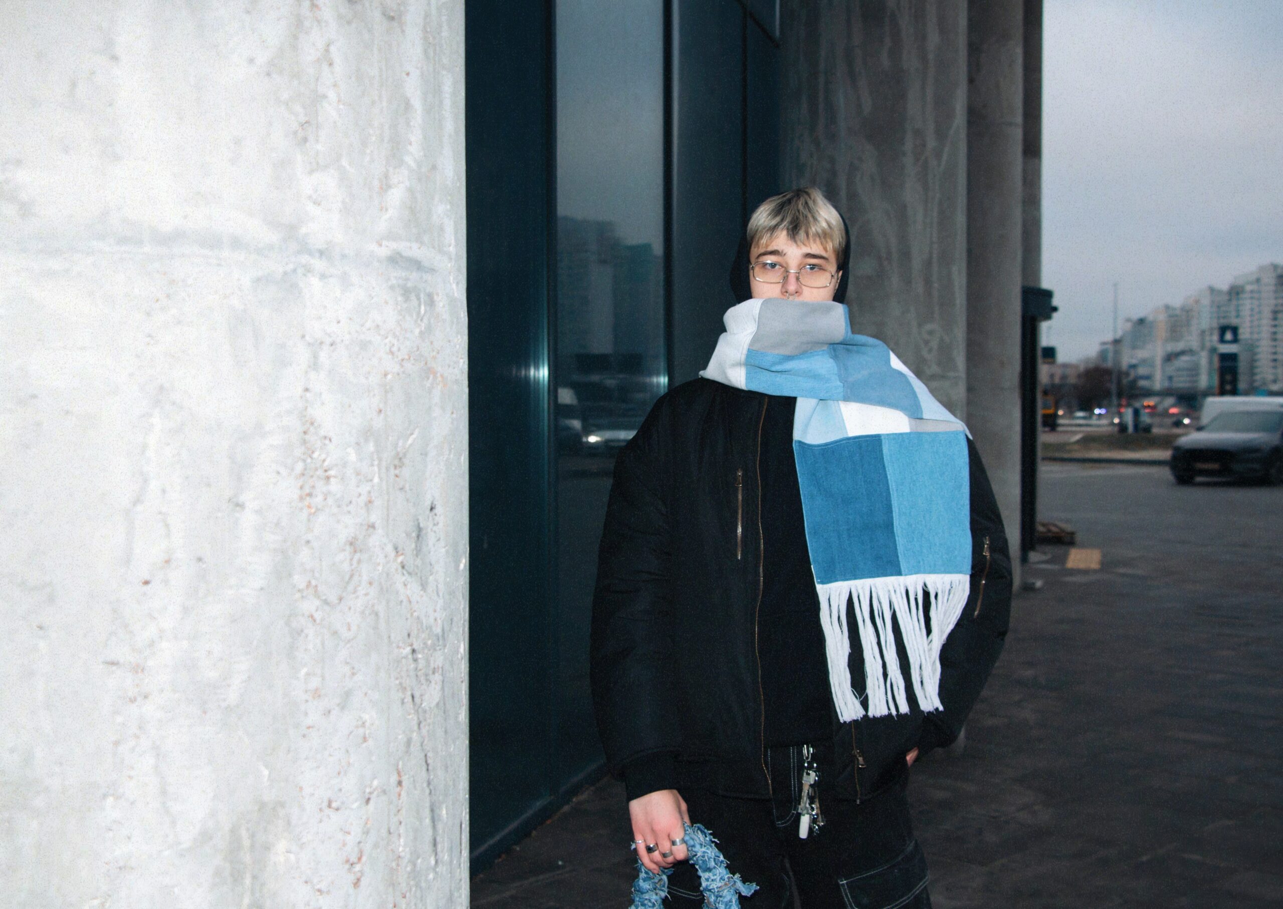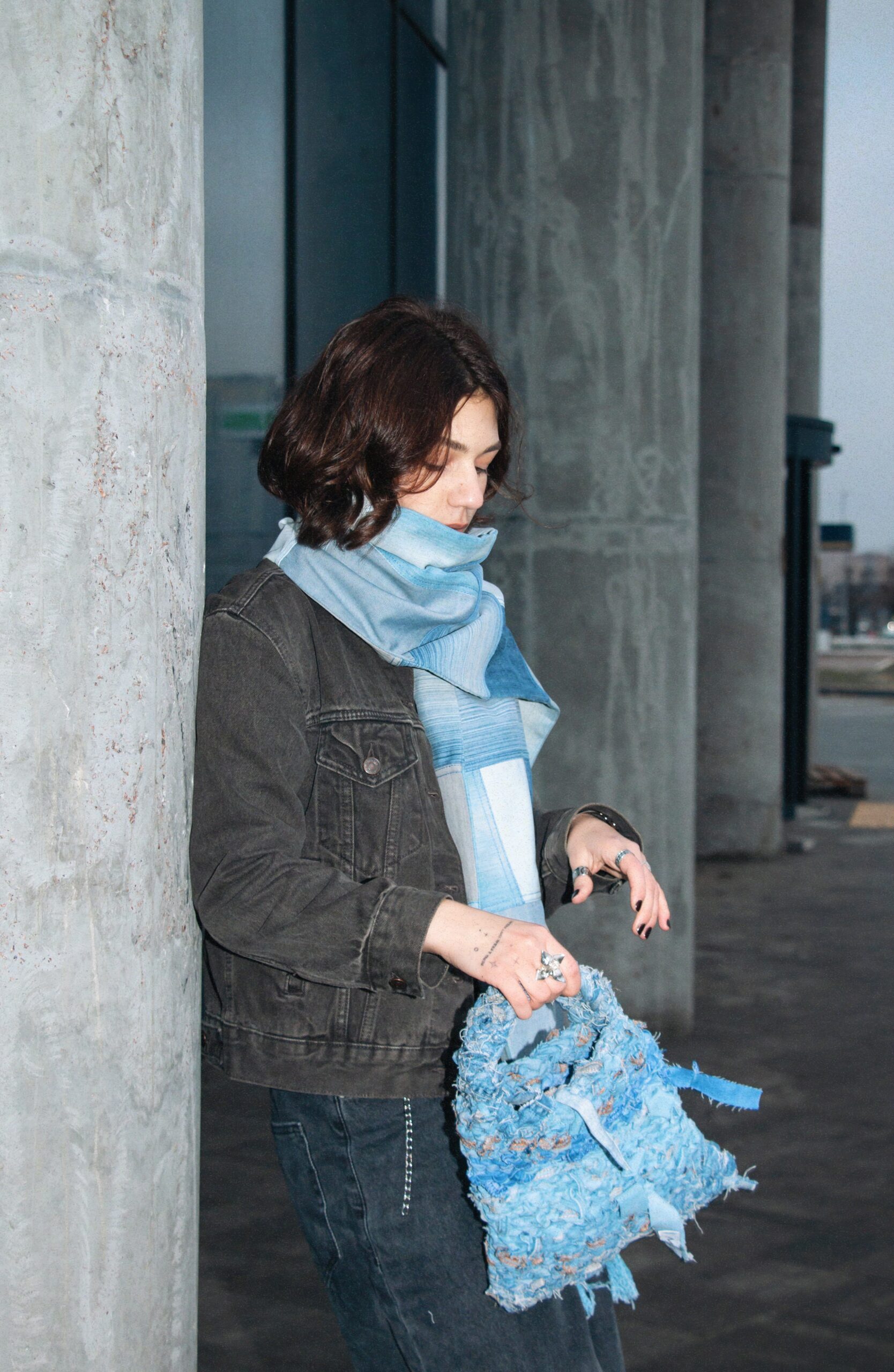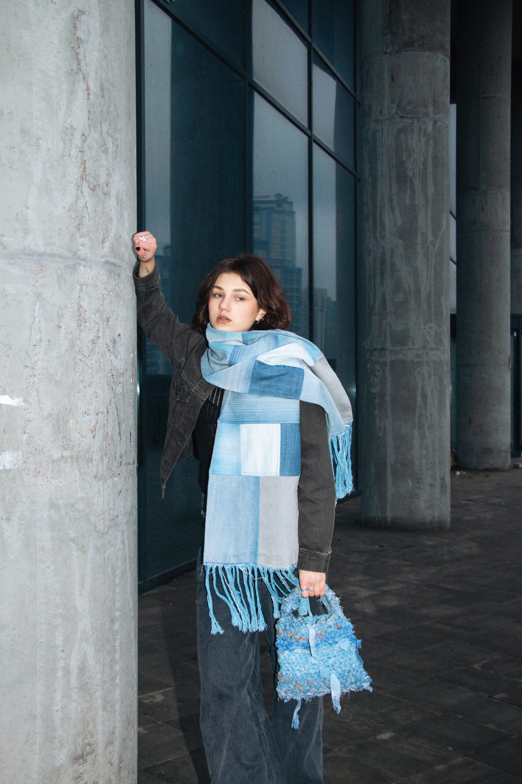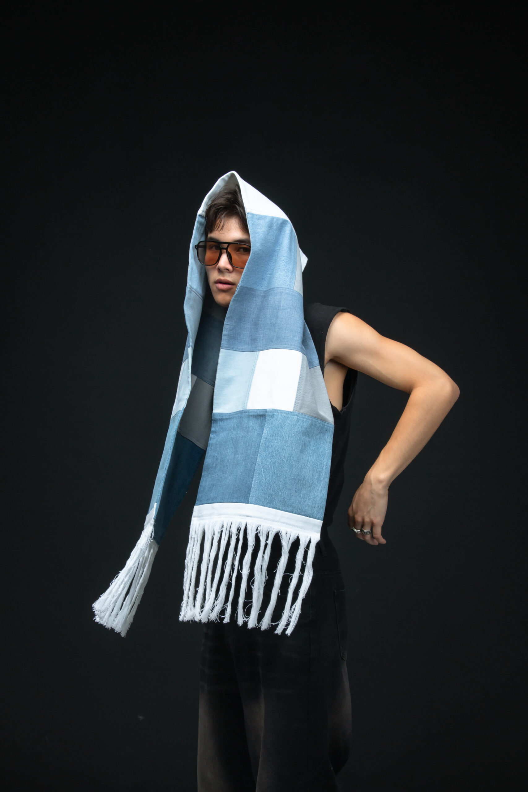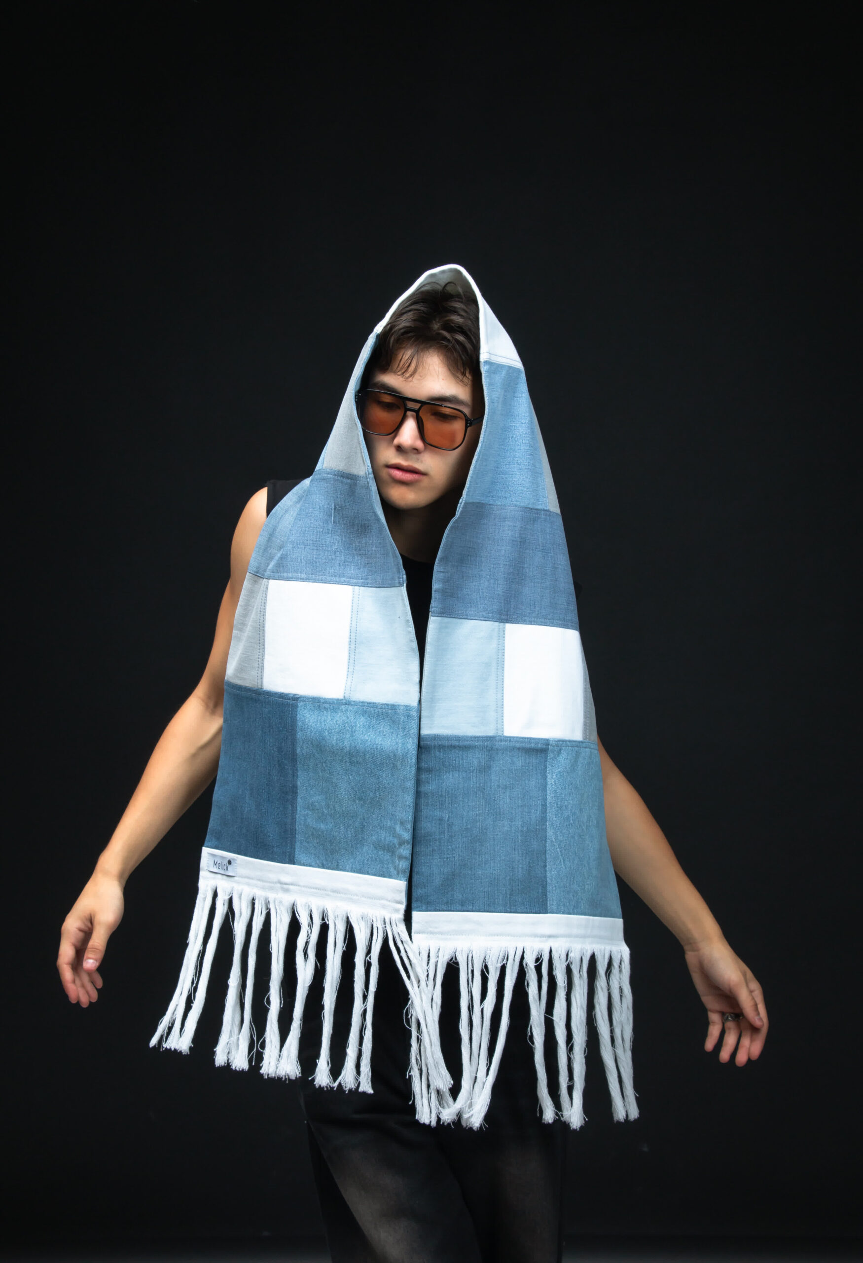 One-of-a-kind wide scarf made from reworked denim with blue color blocks and fringe details.