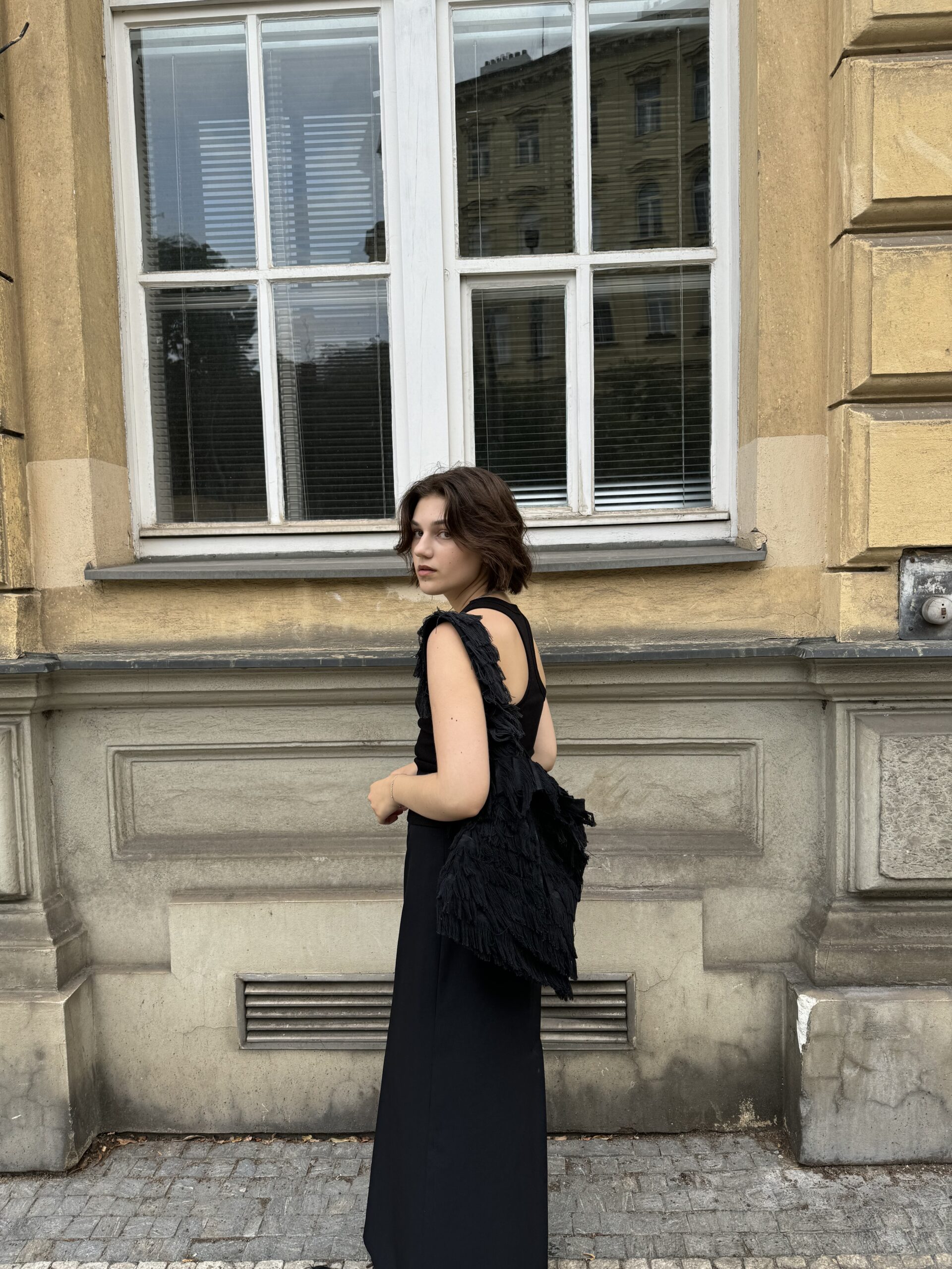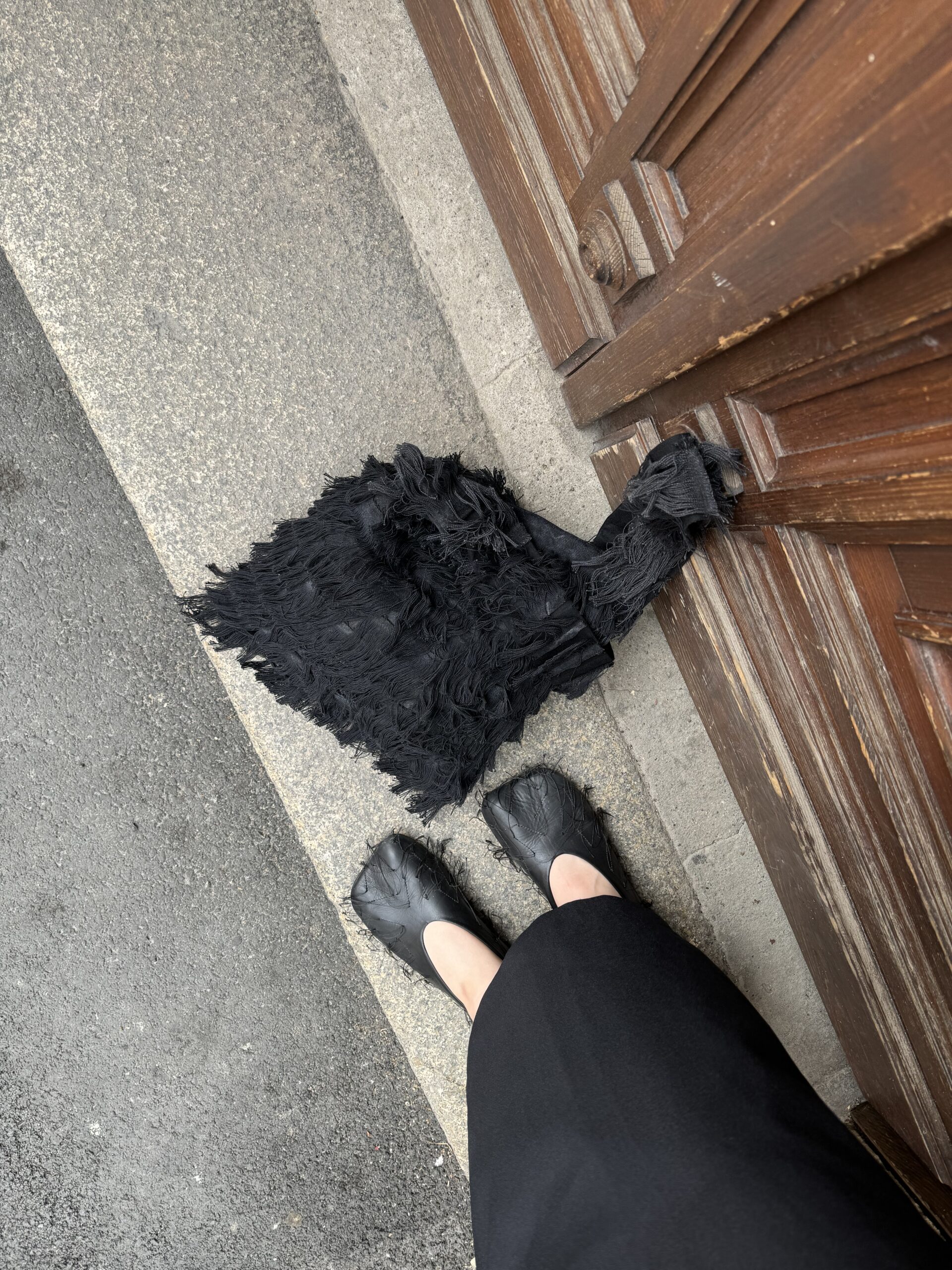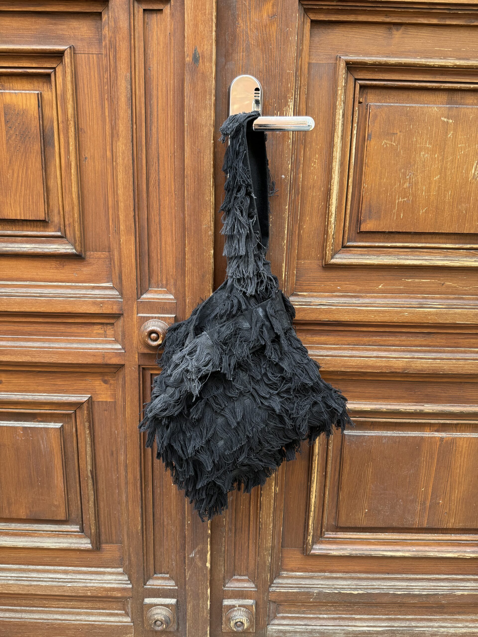 Handcrafted from reworked denim with fringe that resembles fur, it catches the eye and adds uniqueness to your outfit.